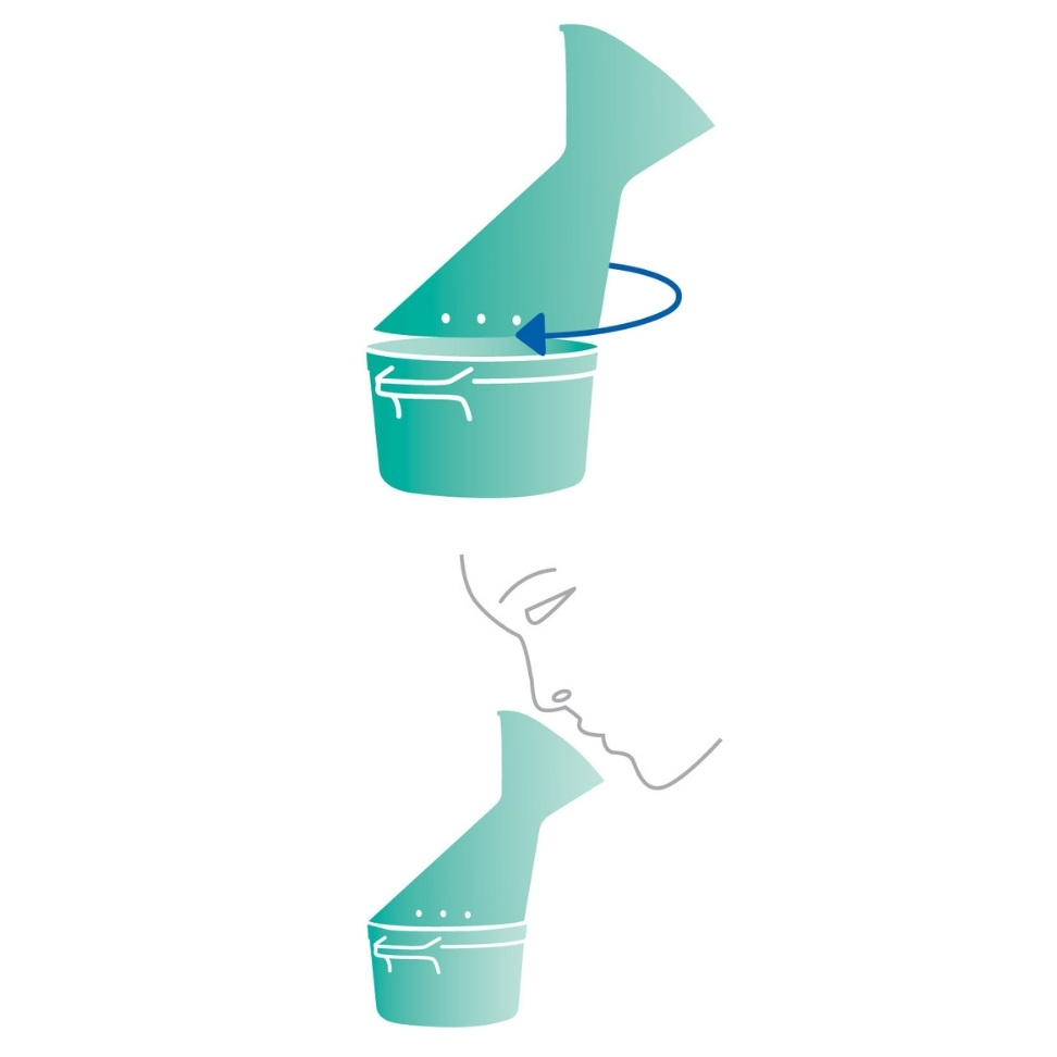 - Die Inhalationsmaske (oberer Teil) auf den Wasserbehälter aufsetzen. Die beiden Führungsteile einrasten und mittels einer Drehbewegung verankern
